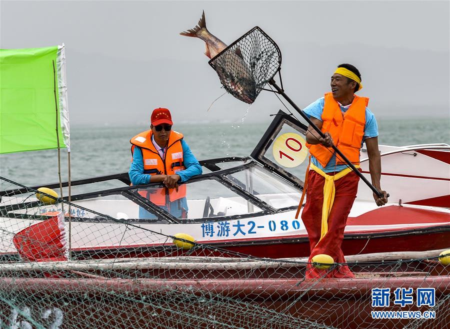 6月22日,博湖縣的魚把頭們在展示剛剛捕撈起的魚。新華社記者 趙戈 攝