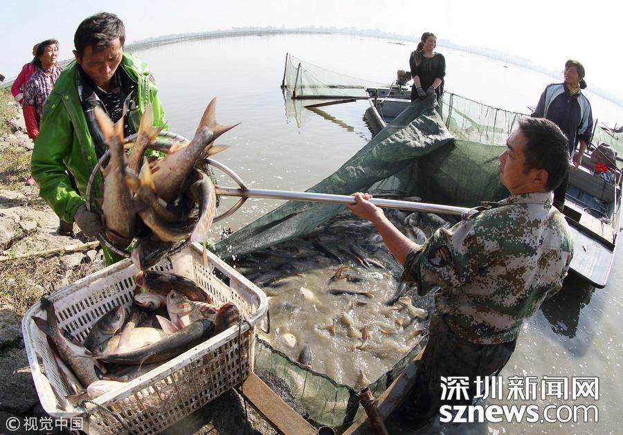 江蘇揚州,漁夫將魚撈出過秤。