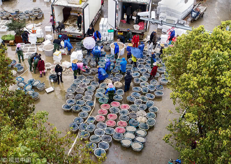 浙江臺(tái)州,三門(mén)縣花橋鎮(zhèn)柵下村的文化禮堂前,村民們冒雨和商販交易蟶苗,現(xiàn)場(chǎng)一片繁忙。據(jù)了解,花橋蟶苗屬于野生苗,存活率高,易成長(zhǎng),極受市場(chǎng)歡迎,一到捕撈季節(jié),遼寧、山東、江蘇和浙江的養(yǎng)殖戶和蟶苗小販爭(zhēng)相到花橋購(gòu)買(mǎi)優(yōu)質(zhì)蟶苗。
