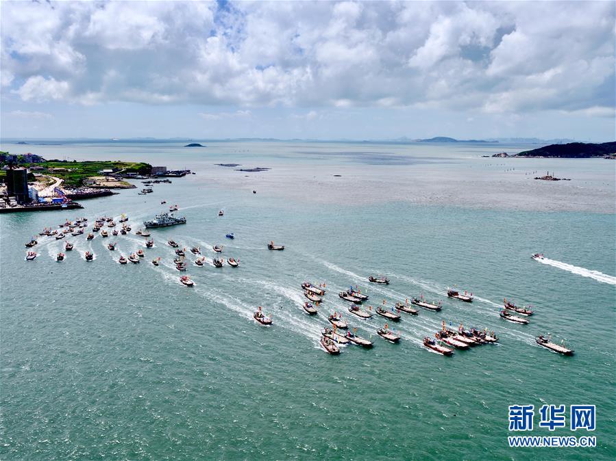 8月3日,在首屆福清開漁節(jié)上,漁船駛向大海(無人機(jī)拍攝)。新華社記者姜克紅攝
