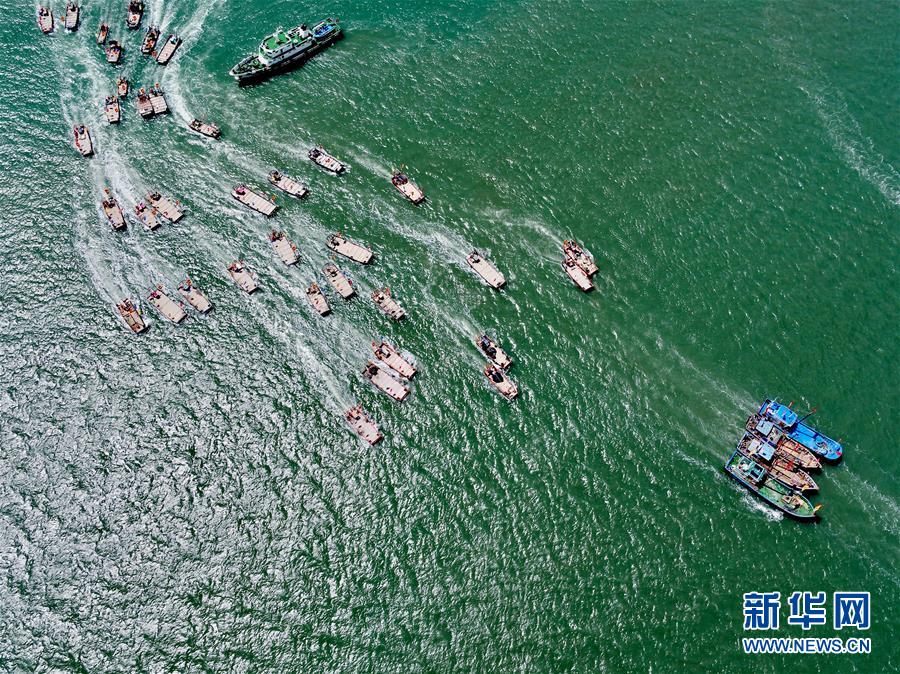8月3日,首屆福清開漁節(jié)增殖放流活動(dòng)上人們?cè)谙虼蠛M斗鹏~苗(無人機(jī)拍攝)。