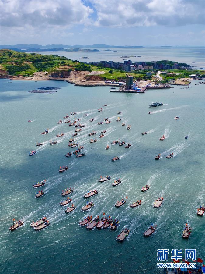 8月3日,在首屆福清開(kāi)漁節(jié)上,漁船駛向大海(無(wú)人機(jī)拍攝)。新華社記者姜克紅攝