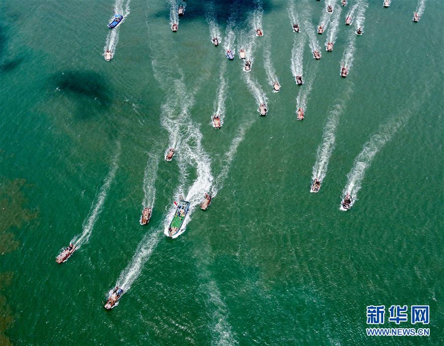 8月3日,在首屆福清開漁節(jié)上,漁船駛向大海(無(wú)人機(jī)拍攝)。新華社記者姜克紅攝