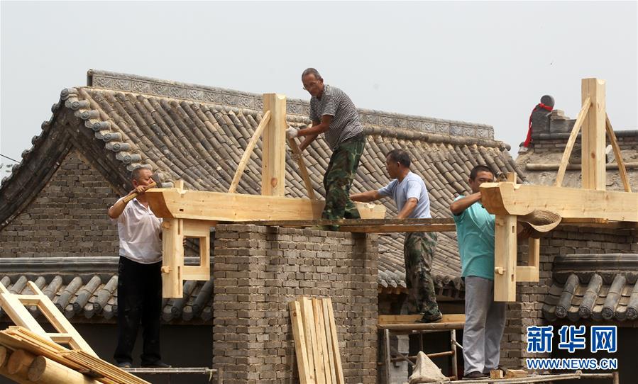 8月7日,在石家莊市井陘礦區(qū)橫西村,工作人員在組裝門樓建筑木架。 新華社記者駱學峰攝