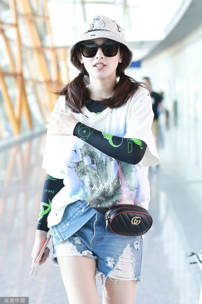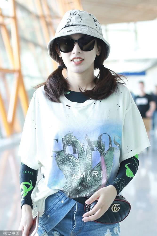 內(nèi)地女星彭小苒現(xiàn)身機(jī)場,穿印花T恤牛仔短褲,白色馬丁靴很時髦