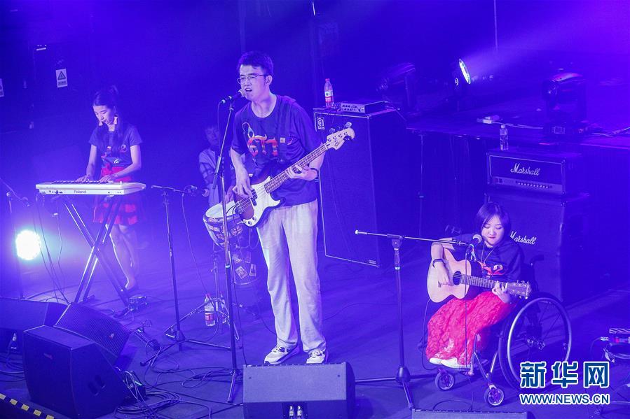 8月14日,8772樂隊成員蘇佳宇(中)在演唱會上表演。 新華社記者張玉薇攝