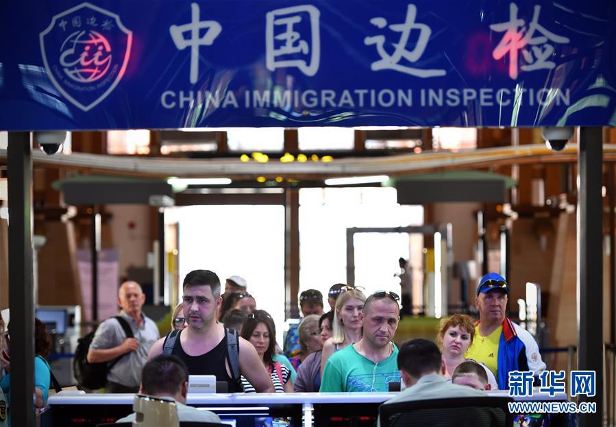 外國(guó)游客在三亞鳳凰國(guó)際機(jī)場(chǎng)通關(guān)入境(2018年6月1日攝)。新華社記者郭程攝