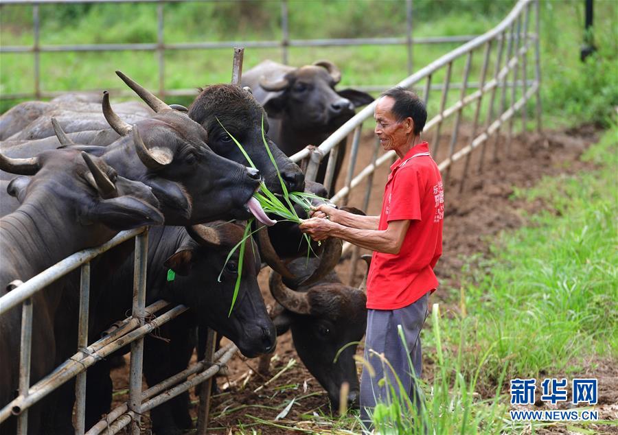 在廣西融安縣大良鎮(zhèn)古蘭村古蘭屯養(yǎng)?;兀?8歲的韋肇翠在喂牛(8月18日攝)。韋肇翠是養(yǎng)?;氐娘曫B(yǎng)員,每個月有2800元的工資。 新華社記者 黃孝邦 攝