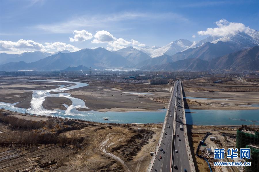 鳥瞰拉薩柳梧大橋(4月3日無人機拍攝)。新華社記者 普布扎西 攝