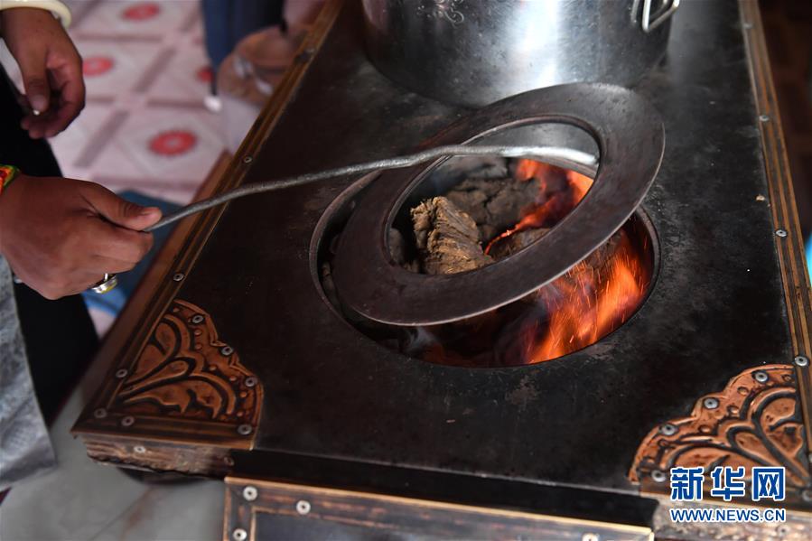 在青海省玉樹藏族自治州治多縣治渠鄉(xiāng)同卡村,村民布沙措江卓瑪給家中的爐子添加燃料——牛糞(9月12日攝)。在當(dāng)?shù)?,清潔環(huán)保的牛糞依然是不少牧民選用的主要燃料。新華社記者 孫瑞博 攝