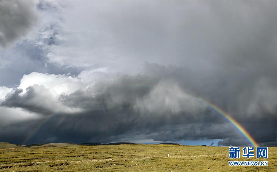 在青海省玉樹藏族自治州治多縣用手機(jī)拍攝的雨后彩虹(9月11日攝)。新華社記者 鄒樂 攝