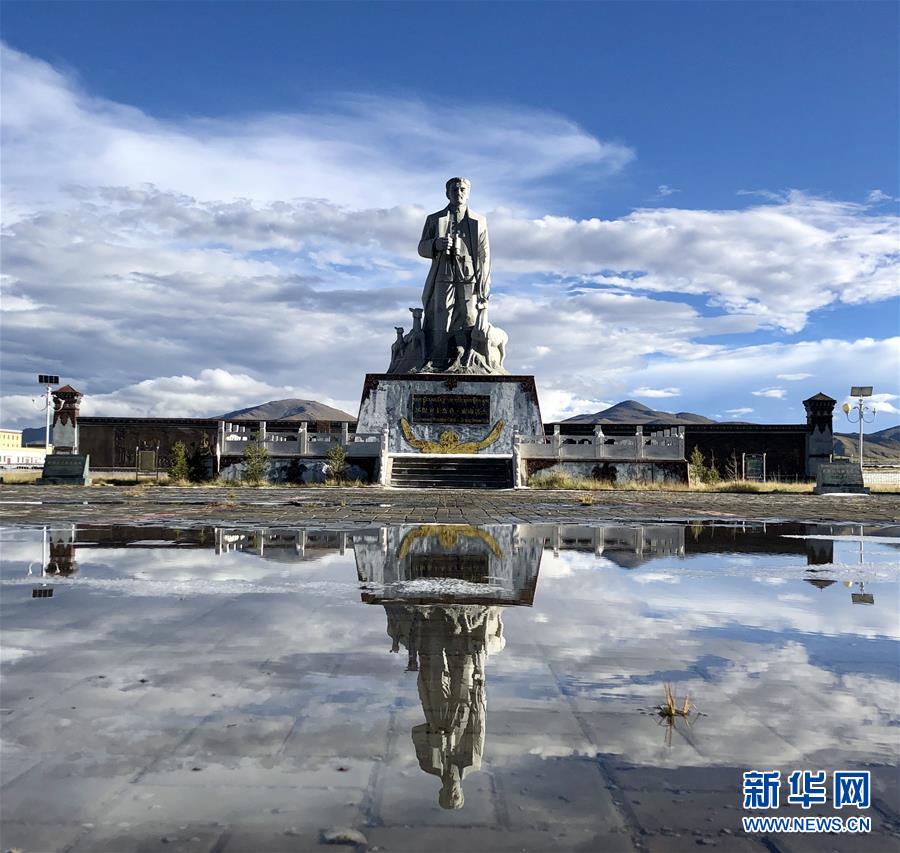 這是在青海省玉樹藏族自治州治多縣用手機(jī)拍攝的“環(huán)保衛(wèi)士”杰桑·索南達(dá)杰的雕像(9月12日攝)。新華社記者 鄒樂 攝