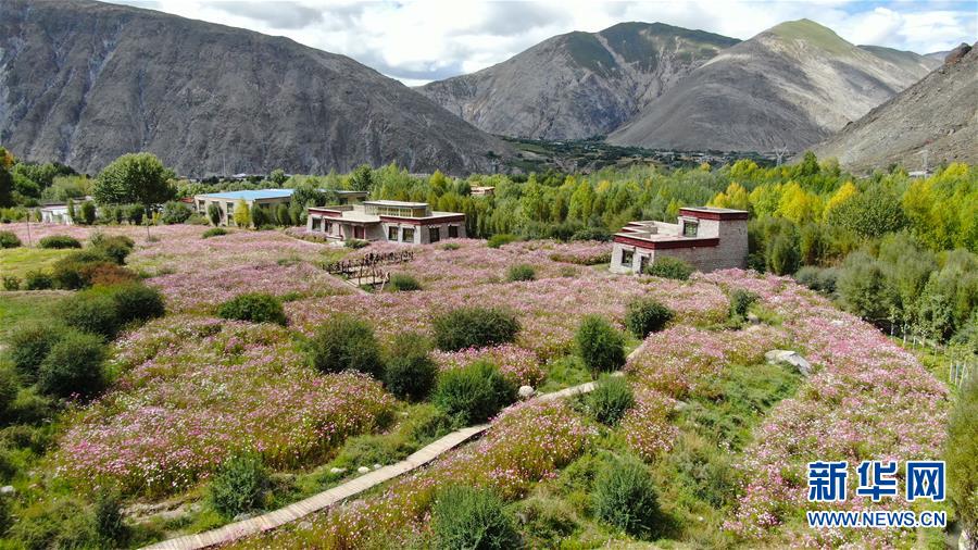 9月13日無人機拍攝的尼木縣山谷間盛開的波斯菊。  新華社記者 晉美多吉 攝