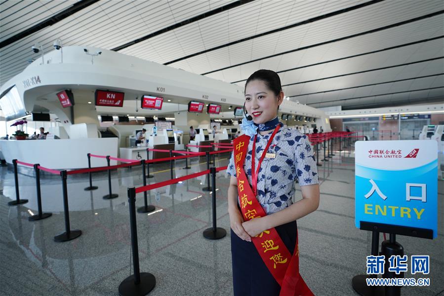 9月25日,中國聯(lián)合航空公司的工作人員在北京大興國際機場航站樓內(nèi)迎接乘客。新華社記者鞠煥宗攝