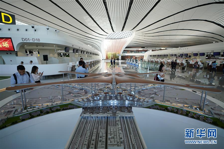 9月25日拍攝的在北京大興國際機場航站樓內(nèi)擺放的機場航站樓模型。新華社記者鞠煥宗攝