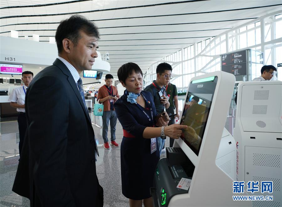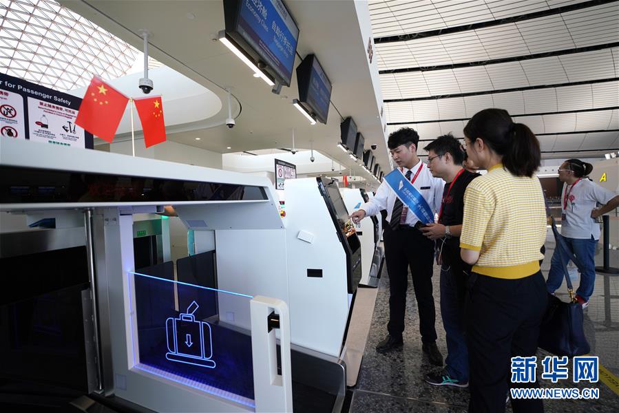 9月25日,中國南方航空公司工作人員(左)在北京大興國際機場介紹自助行李托運設(shè)備。新華社記者鞠煥宗攝