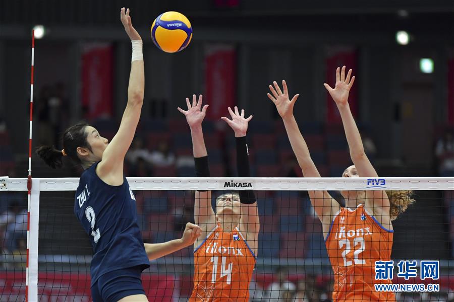 9月27日,中國隊球員朱婷(左)在比賽中進攻。當日,在日本大阪舉行的2019年女排世界杯賽第三階段A組循環(huán)賽中,中國隊以3比1戰(zhàn)勝荷蘭隊。新華社記者朱煒攝