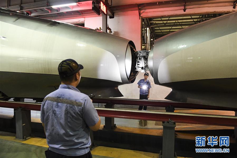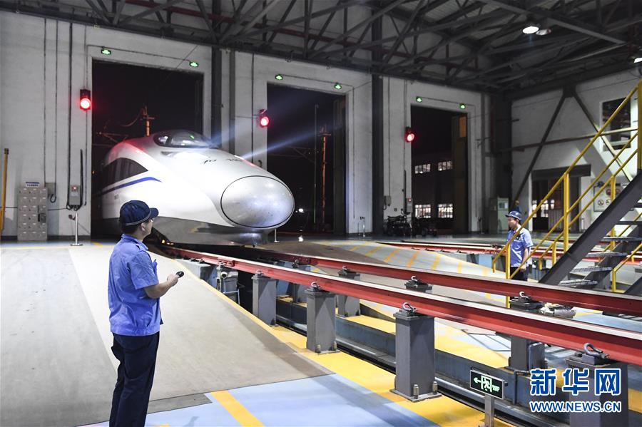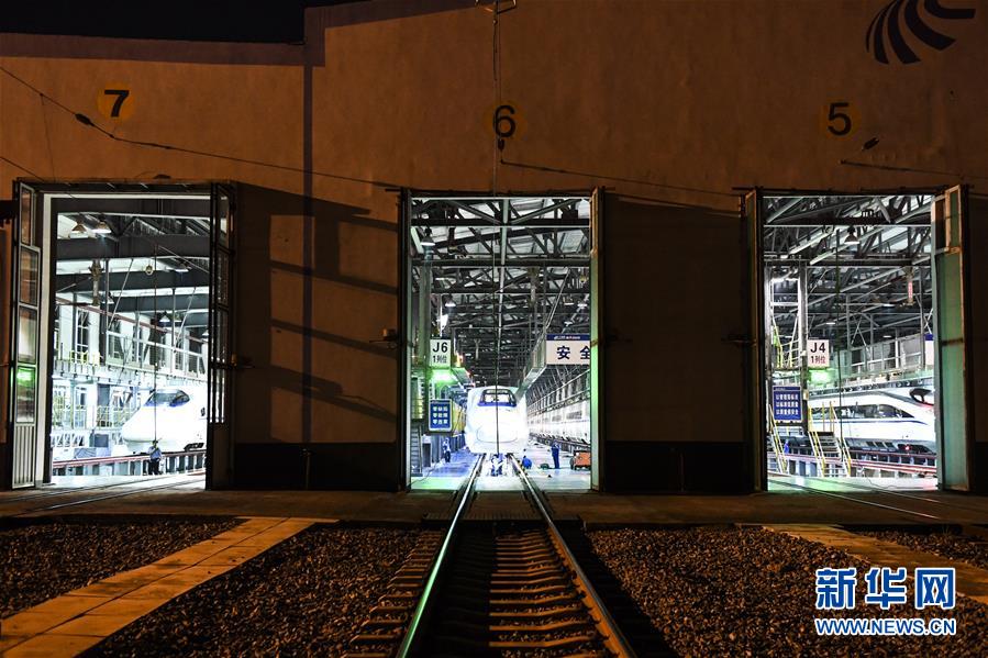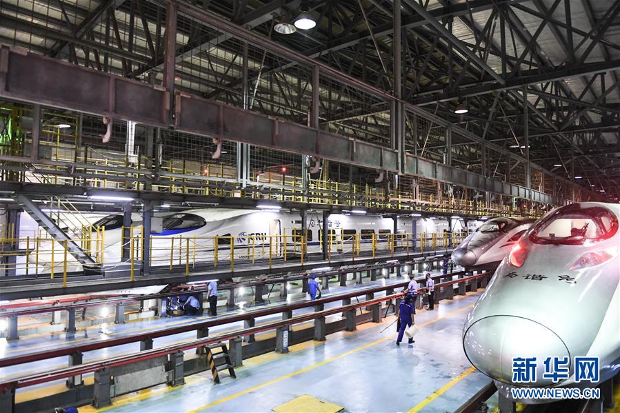 “動(dòng)車(chē)醫(yī)生”們?cè)谀蠈巹?dòng)車(chē)所檢查庫(kù)內(nèi)忙碌(10月2日攝)。 新華社記者 曹祎銘 攝