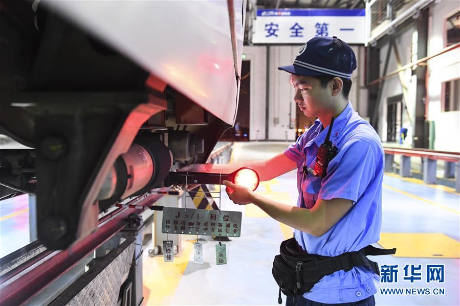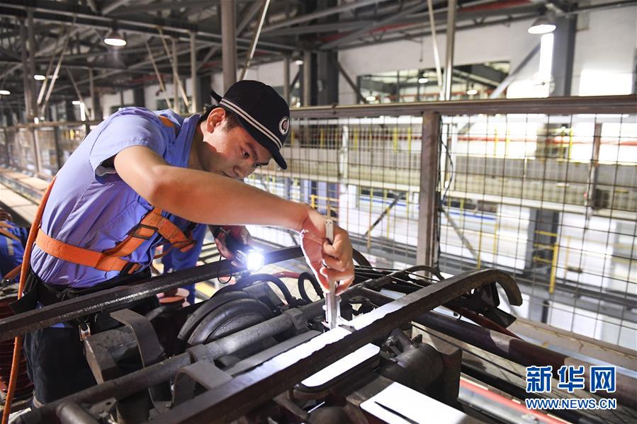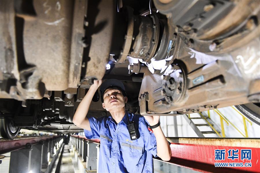“動(dòng)車(chē)醫(yī)生”在地溝內(nèi)對(duì)動(dòng)車(chē)進(jìn)行檢查(10月2日攝)。 新華社記者 曹祎銘 攝