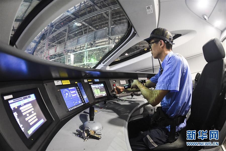“動(dòng)車(chē)醫(yī)生”在進(jìn)行動(dòng)車(chē)組放電作業(yè)(10月2日攝)。 新華社記者 曹祎銘 攝