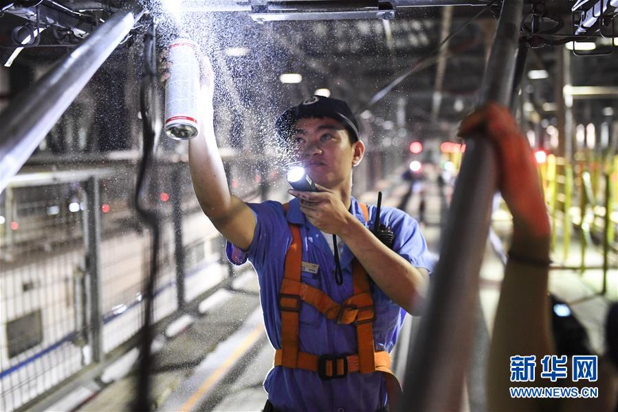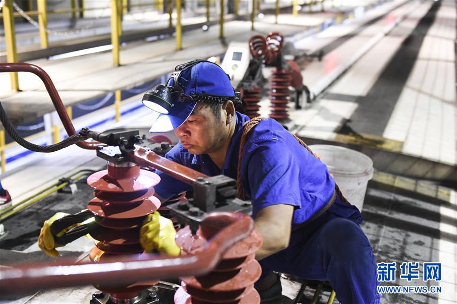 工人在擦洗車(chē)頂絕緣子(10月2日攝)。 新華社記者 曹祎銘 攝