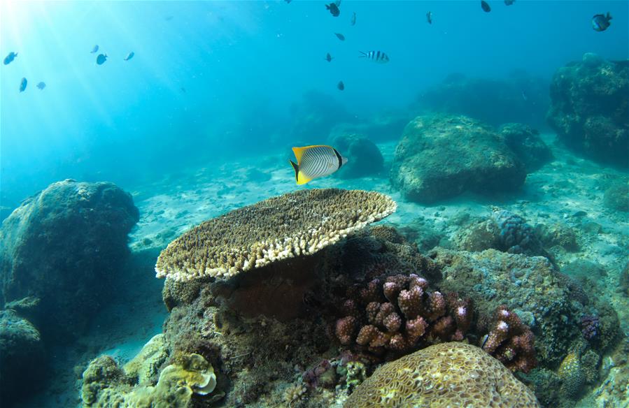 在分界洲島海域,魚兒在珊瑚附近游動覓食(10月4日攝)。新華社記者楊冠宇攝