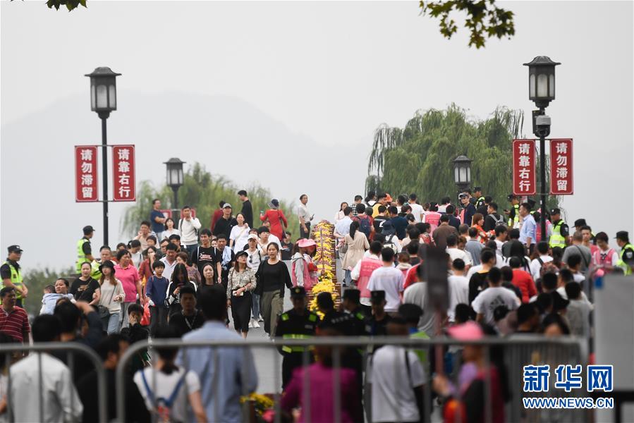 10月7日,杭州西湖風景區(qū)的斷橋上游人絡繹不絕。