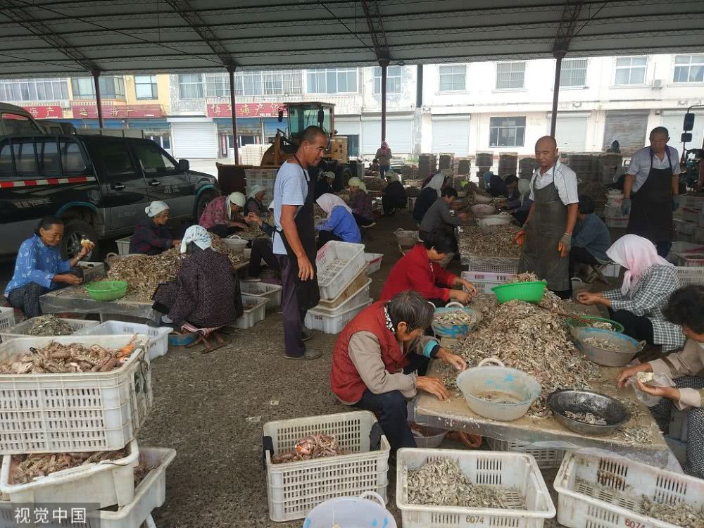 2019年9月13日,農(nóng)歷八月十五中秋節(jié),山東濱州沾化區(qū)魯北海產(chǎn)品批發(fā)市場,村民正在分揀貨物。