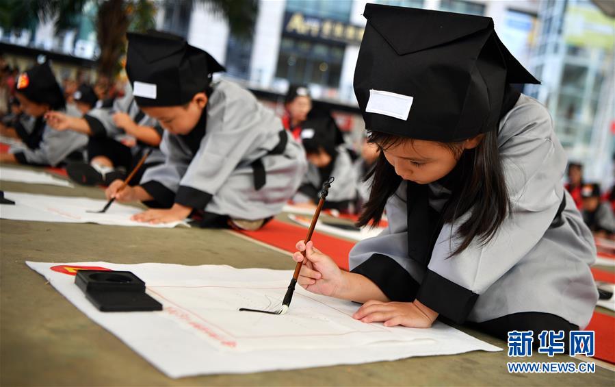 10月13日,參加儀式的小朋友在書寫“人”字。當(dāng)日,??诤嬌賰核囆g(shù)中心為500名小朋友舉行“開筆禮”,通過“點朱砂,啟智慧”“習(xí)書法,描人字”等儀式讓孩子們體驗中國傳統(tǒng)文化。新華社記者郭程攝