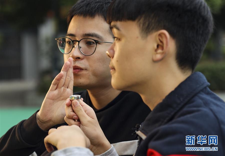 重慶市特殊教育中心老師李沂念(左一)在教授盲童王太樊練習(xí)小號(hào)吹奏的氣息(10月10日攝)。 新華社記者 劉潺 攝