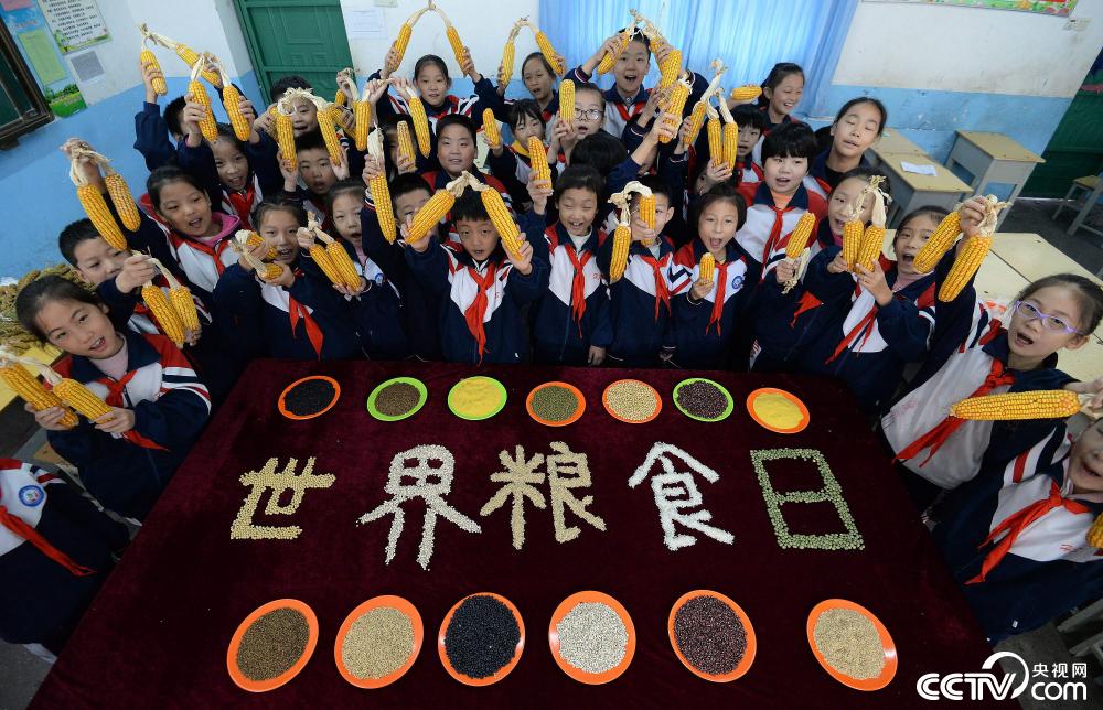 2019年10月15日,河北省邯鄲市邯山區(qū)滏河學(xué)校的學(xué)生們用糧食作物拼成“世界糧食日”字樣,呼吁大家愛(ài)糧節(jié)糧。圖片來(lái)源:視覺(jué)中國(guó)