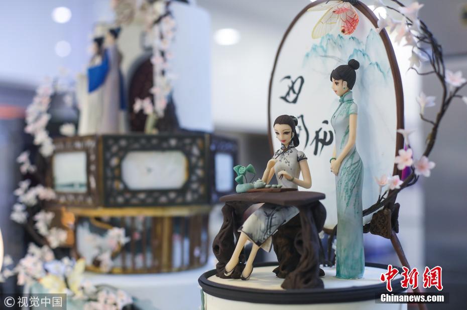 杭州翻糖蛋糕師將白娘子、雷峰塔等杭州文化符號(hào)雕刻在翻糖蛋糕上,從最基礎(chǔ)的設(shè)計(jì)和構(gòu)思,然后動(dòng)手制作、調(diào)色,最后組裝,濃濃的“中國(guó)風(fēng)”融合舌尖上的甜美藝術(shù),碰撞出了意想不到的火花。圖片來(lái)源:視覺(jué)中國(guó)