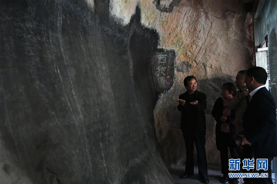 10月16日,成縣文物保護(hù)專家張建文(左一)向客人講解漢代摩崖石刻《西狹頌》。新華社記者陳斌攝