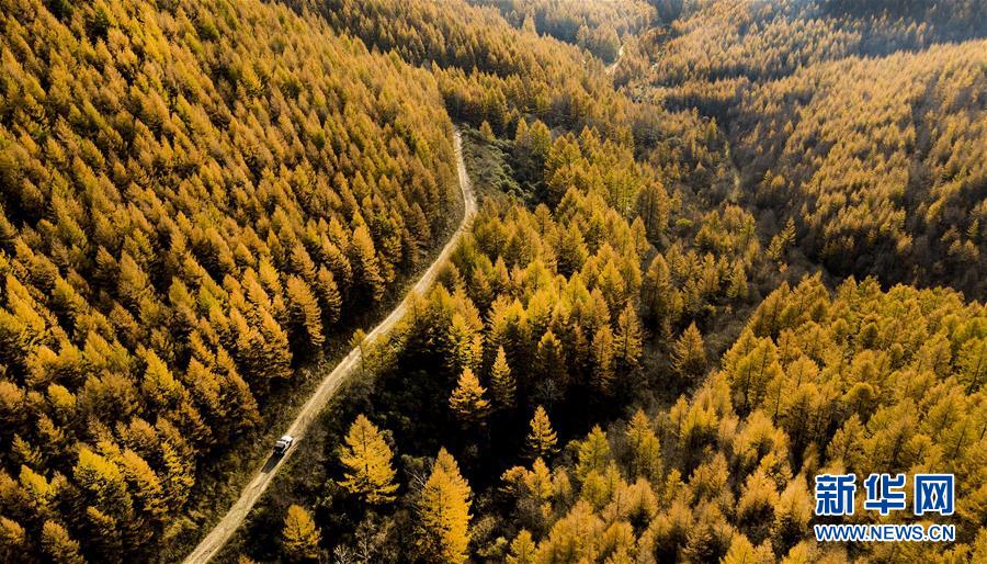 10月8日,一輛汽車行駛在好地方林場(chǎng)的林間道路上(無(wú)人機(jī)拍攝)。新華社記者陶明攝