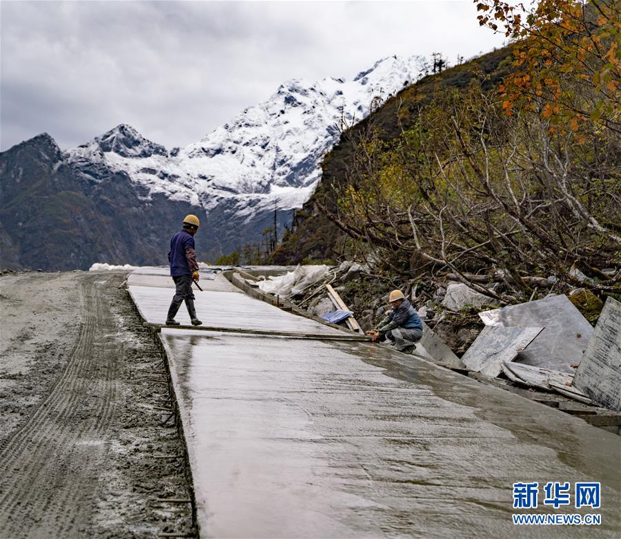 工人們?cè)谂赡r(nóng)村公路施工現(xiàn)場作業(yè)(10月24日攝)。新華社記者普布扎西攝