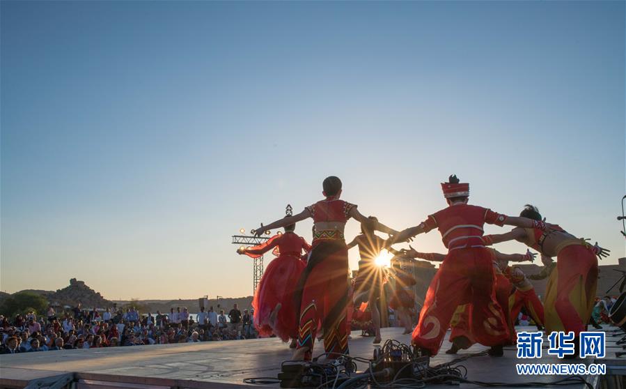 10月27日,來自福建省廈門市的小白鷺民間舞團(tuán)的演員在位于埃及阿斯旺的菲萊神廟表演。  新華社記者 鄔惠我 攝
