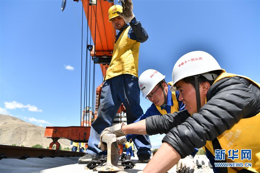 6月6日,負責鋪軌的中鐵十一局集團的建設(shè)者在現(xiàn)場作業(yè)。新華社記者李鑫攝
