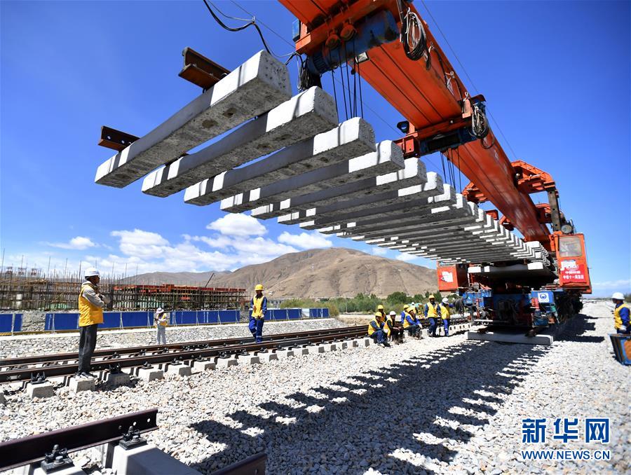 6月6日,負責鋪軌的中鐵十一局集團的建設(shè)者在現(xiàn)場作業(yè)。新華社記者覺果攝