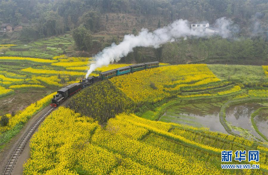 3月20日,一列嘉陽小火車在油菜花叢中穿行(無人機拍攝)。