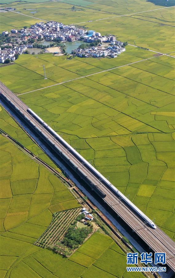 10月29日,列車從廣西賓陽縣古辣鎮(zhèn)豐收的稻田間駛過(無人機拍攝)。新華社記者陸波岸攝