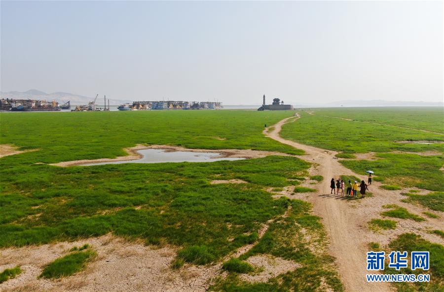 10月9日,江西省廬山市,游客行走在鄱陽湖湖區(qū)干涸的湖面上。新華社記者胡晨歡攝