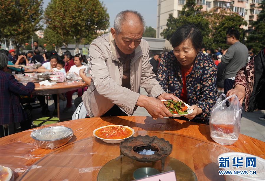 11月2日,南京仙林街道仙林新村社區(qū)居民錢(qián)序仁(左)和呂桂英帶上自己做的菜前來(lái)赴宴。 新華社記者 季春鵬 攝