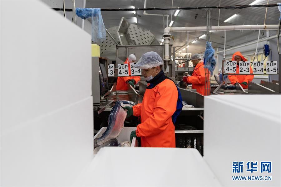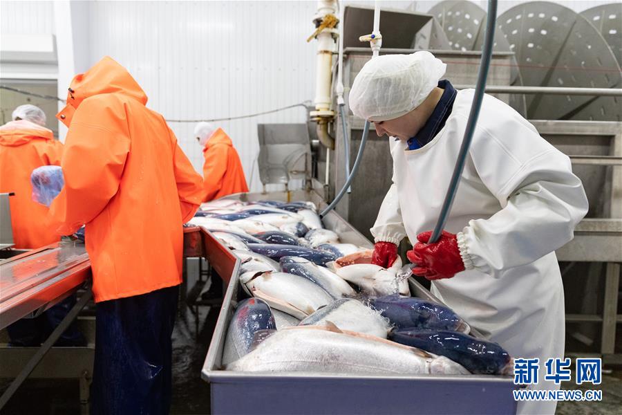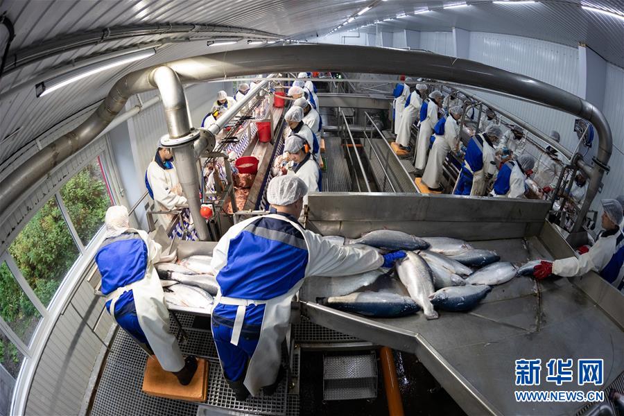 9月13日,在俄羅斯摩爾曼斯克,俄羅斯水產(chǎn)養(yǎng)殖公司工作人員在車(chē)間處理鮭魚(yú)。 新華社記者白雪騏攝