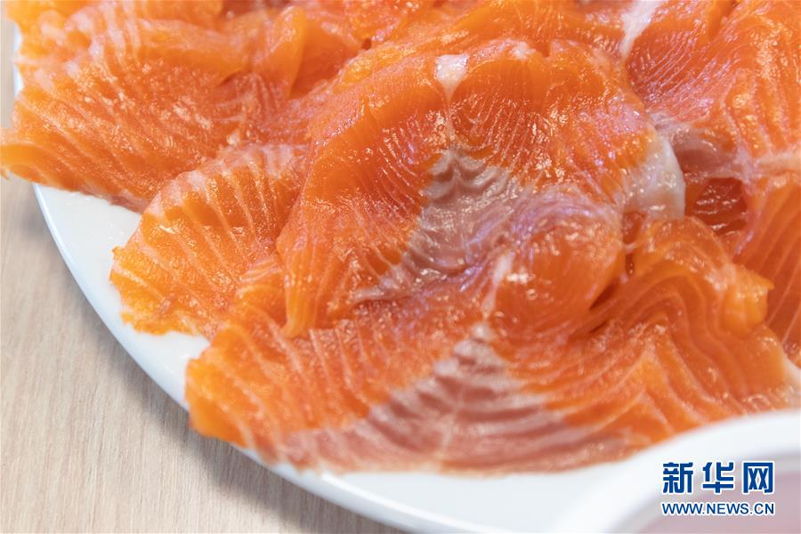 這是9月13日在俄羅斯摩爾曼斯克以北的巴倫支海域的鮭魚(yú)養(yǎng)殖場(chǎng)拍攝的鮭魚(yú)肉片。 新華社記者白雪騏攝
