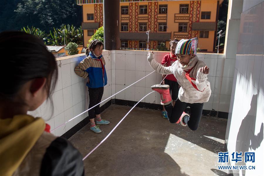 在獨龍江鄉(xiāng)中心小學,孩子們在跳皮筋(2016年11月23日攝)。新華社記者胡超攝