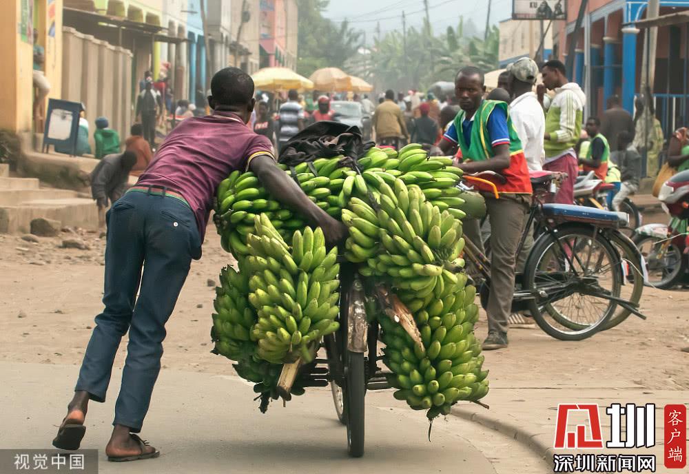 剛果,工人們將香蕉放在自行車(chē)上運(yùn)往市場(chǎng)。