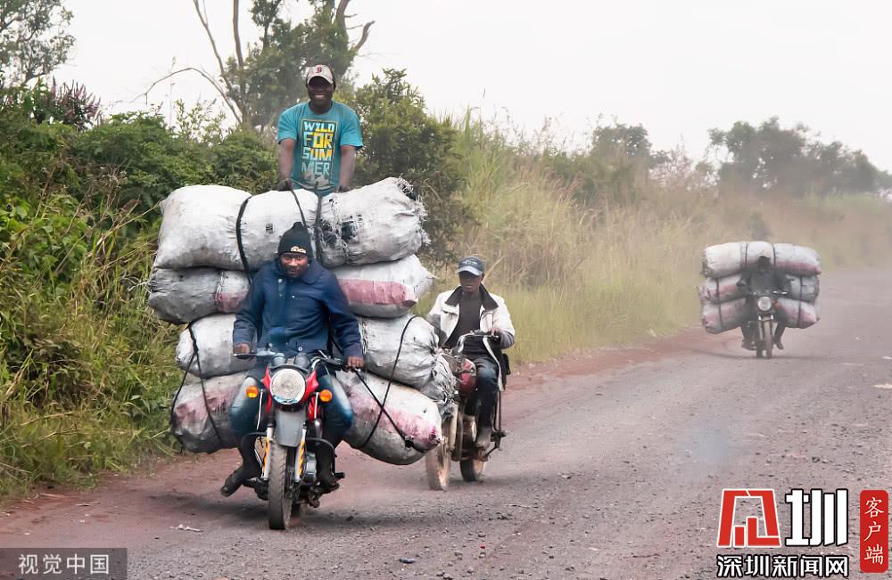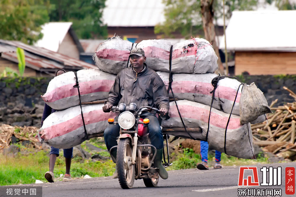 剛果,工人們將裝滿(mǎn)木炭的麻袋放在摩托車(chē)上,從維龍加國(guó)家公園運(yùn)到剛果戈馬市。