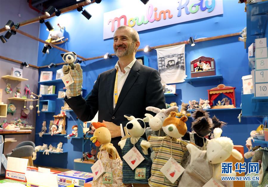 11月5日,在第二屆進(jìn)博會品質(zhì)生活展區(qū),來自法國的玩具品牌展商手持兒童手偶玩具。新華社記者劉穎攝