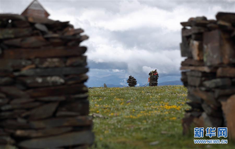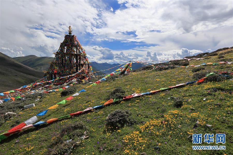 在川藏公路四川折多山埡口,藍(lán)天白云與經(jīng)幡、草地、鮮花構(gòu)成一幅美麗畫(huà)卷(6月28日攝)。新華社記者江宏景攝