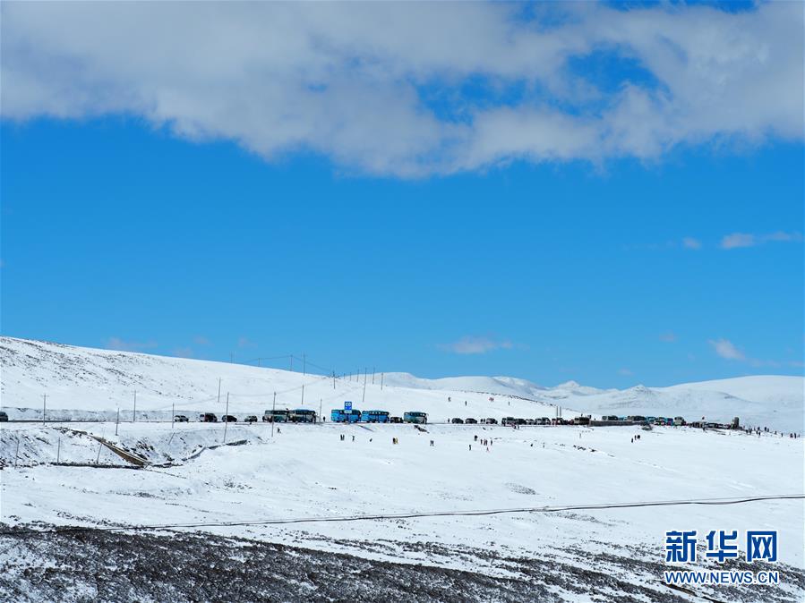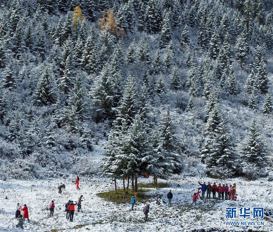 在318國(guó)道四川卡子拉山埡口,游人在雪地里留影、嬉戲(10月17日攝)。新華社記者江宏景攝